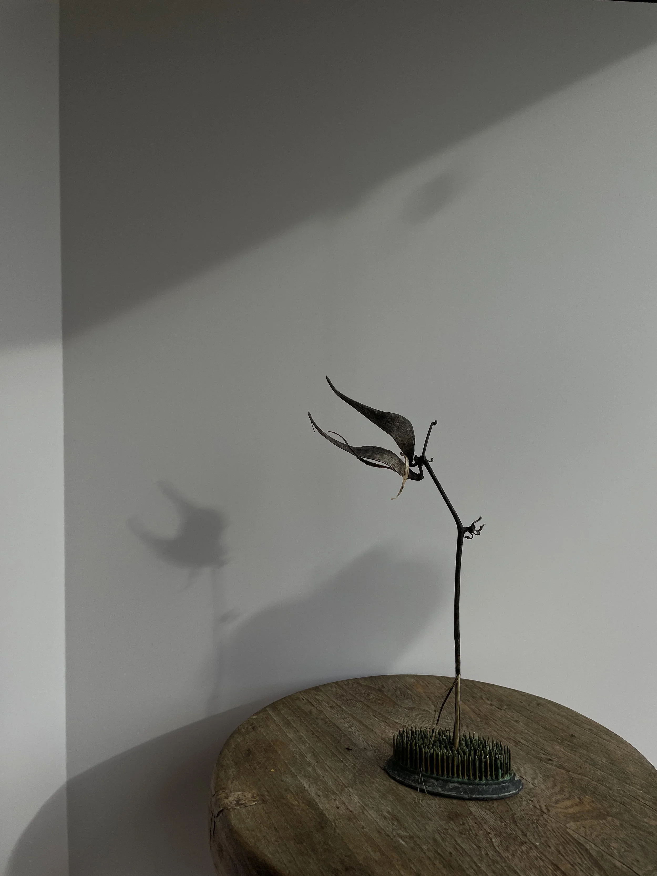 I used a stool and a vintage frog to set up my flowers, setting them up several inches from the board as not to create shadows.